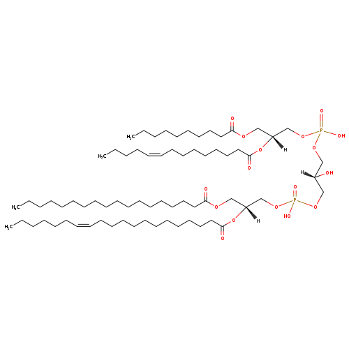 | YMDB03442 | CL(10:0/14:1(9Z)/18:0/20:1(13Z)) | [(2R)-3-(decanoyloxy)-2-[(9Z)-tetradec-9-enoyloxy]propoxy][(2R)-2-hydroxy-3-({hydroxy[(2R)-2-[(13Z)-icos-13-enoyloxy]-3-(octadecanoyloxy)propoxy]phosphoryl}oxy)propoxy]phosphinic acid | C71H134O17P2 1321.784 | |
