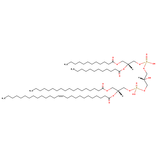 | YMDB07670 | CL(14:0/18:0/18:0/18:1(11Z)) | [(2S)-2-hydroxy-3-({hydroxy[(2R)-2-(octadecanoyloxy)-3-(tetradecanoyloxy)propoxy]phosphoryl}oxy)propoxy][(2R)-2-[(11Z)-octadec-11-enoyloxy]-3-(octadecanoyloxy)propoxy]phosphinic acid | C77H148O17P2 1407.962 | |