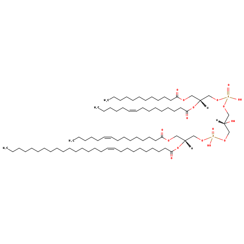 | YMDB06942 | CL(14:0/14:1(9Z)/14:1(9Z)/26:1(9Z)) | [(2R)-3-({[(2R)-2-[(10Z)-heptacos-10-enoyloxy]-3-[(9Z)-tetradec-9-enoyloxy]propoxy](hydroxy)phosphoryl}oxy)-2-hydroxypropoxy][(2R)-2-[(9Z)-tetradec-9-enoyloxy]-3-(tetradecanoyloxy)propoxy]phosphinic acid | C78H146O17P2 1417.957 | |