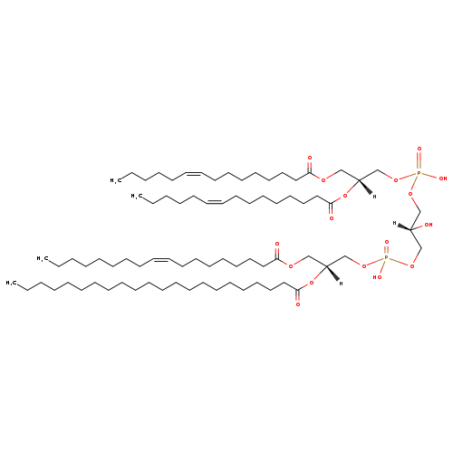 | YMDB09470 | CL(14:1(9Z)/16:0/16:1(11Z)/24:1(9Z)) | [(2R)-3-[(11Z)-hexadec-11-enoyloxy]-2-[(9Z)-tetracos-9-enoyloxy]propoxy][(2S)-3-({[(2R)-2-(hexadecanoyloxy)-3-[(9Z)-tetradec-9-enoyloxy]propoxy](hydroxy)phosphoryl}oxy)-2-hydroxypropoxy]phosphinic acid | C79H148O17P2 1431.984 | |