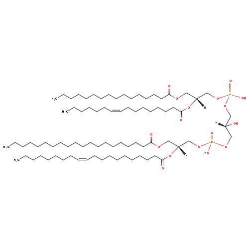 | YMDB08470 | CL(14:1(11Z)/16:0/18:0/24:1(9Z)) | [(2S)-3-({[(2R)-2-(hexadecanoyloxy)-3-[(11Z)-tetradec-11-enoyloxy]propoxy](hydroxy)phosphoryl}oxy)-2-hydroxypropoxy][(2R)-3-(octadecanoyloxy)-2-[(9Z)-tetracos-9-enoyloxy]propoxy]phosphinic acid | C81H154O17P2 1462.054 | |