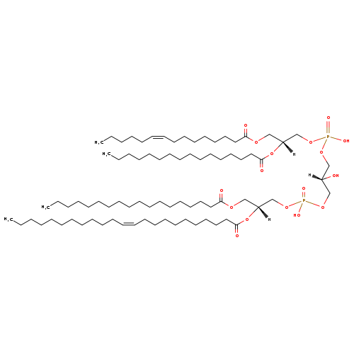 | YMDB10783 | CL(15:1(9Z)/16:0/18:0/23:1(11Z)) | [(2R)-2-(hexadecanoyloxy)-3-[(9Z)-pentadec-9-enoyloxy]propoxy][(2R)-2-hydroxy-3-({hydroxy[(2R)-3-(octadecanoyloxy)-2-[(11Z)-tricos-11-enoyloxy]propoxy]phosphoryl}oxy)propoxy]phosphinic acid | C81H154O17P2 1462.054 | |