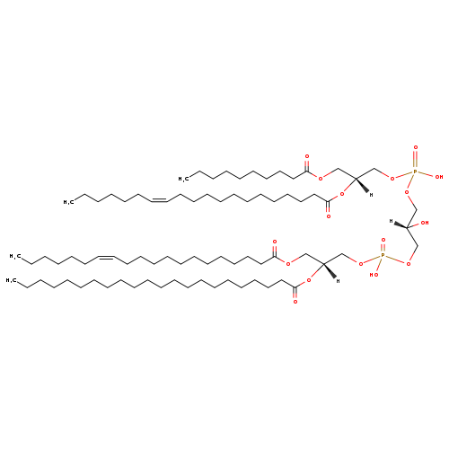 | YMDB11072 | CL(16:0/18:1(9Z)/18:1(9Z)/20:0) | [(2R)-3-(hexadecanoyloxy)-2-[(9Z)-octadec-9-enoyloxy]propoxy][(2R)-2-hydroxy-3-({hydroxy[(2R)-2-(icosanoyloxy)-3-[(9Z)-octadec-9-enoyloxy]propoxy]phosphoryl}oxy)propoxy]phosphinic acid | C81H154O17P2 1462.054 | |