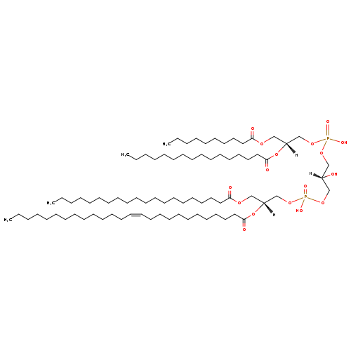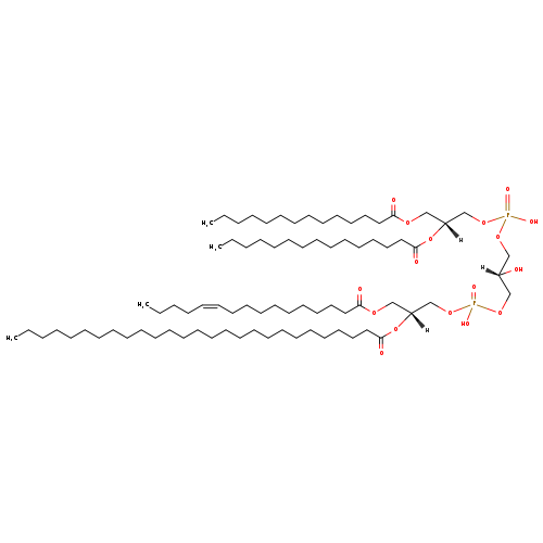 | YMDB07695 | CL(14:0/18:0/20:0/20:1(11Z)) | [(2S)-2-hydroxy-3-({hydroxy[(2R)-2-(octadecanoyloxy)-3-(tetradecanoyloxy)propoxy]phosphoryl}oxy)propoxy][(2R)-2-[(11Z)-icos-11-enoyloxy]-3-(icosanoyloxy)propoxy]phosphinic acid | C81H156O17P2 1464.07 | |