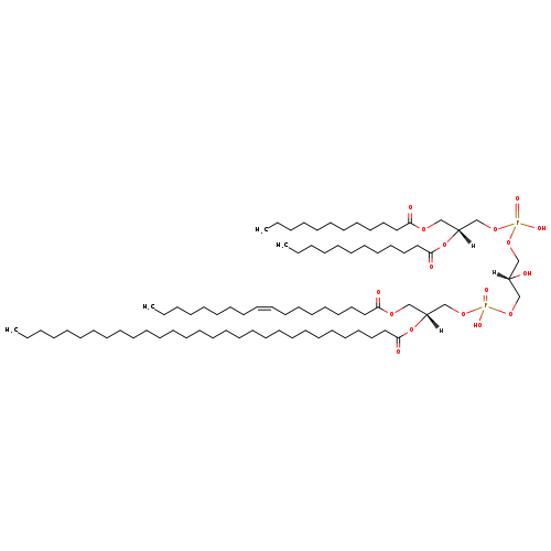 | YMDB07691 | CL(14:0/18:0/18:1(9Z)/22:0) | [(2R)-2-(docosanoyloxy)-3-[(9Z)-octadec-9-enoyloxy]propoxy][(2S)-2-hydroxy-3-({hydroxy[(2R)-2-(octadecanoyloxy)-3-(tetradecanoyloxy)propoxy]phosphoryl}oxy)propoxy]phosphinic acid | C81H156O17P2 1464.07 | |