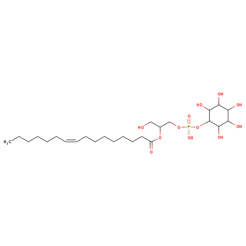 | YMDB13349 | Lyso-PI(0:0/16:1(9Z)) | {2-[(9Z)-hexadec-9-enoyloxy]-3-hydroxypropoxy}[(2,3,4,5,6-pentahydroxycyclohexyl)oxy]phosphinic acid | C25H47O12P 570.613 | |