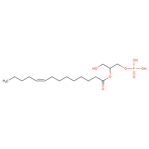 | YMDB13297 | LPA(0:0/14:1(11Z)) | {3-hydroxy-2-[(11Z)-tetradec-11-enoyloxy]propoxy}phosphonic acid | C17H33O7P 380.418 | |