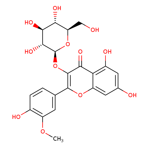 | YMDB01721 | Isorhamnetin 3-O-glucoside | 5,7-dihydroxy-2-(4-hydroxy-3-methoxyphenyl)-3-{[(2S,3R,4S,5S,6R)-3,4,5-trihydroxy-6-(hydroxymethyl)oxan-2-yl]oxy}-4H-chromen-4-one | C22H22O12 478.4029 | |
