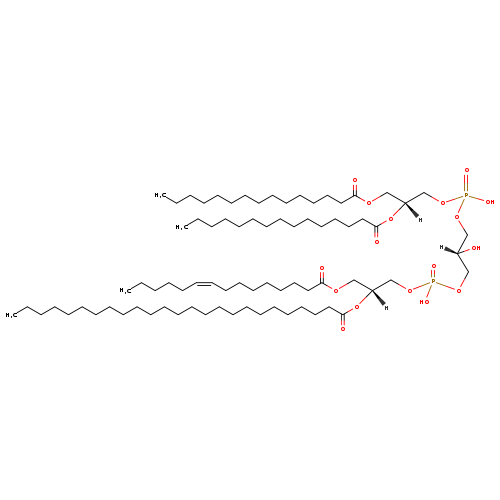 | YMDB09825 | CL(15:0/15:0/15:0/15:0) | [(2R)-2,3-bis(pentadecanoyloxy)propoxy][3-({[(2R)-2,3-bis(pentadecanoyloxy)propoxy](hydroxy)phosphoryl}oxy)-2-hydroxypropoxy]phosphinic acid | C69H134O17P2 1297.762 | |