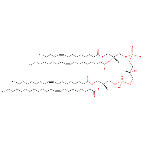 | YMDB09820 | CL(14:1(9Z)/22:1(11Z)/14:1(9Z)/22:1(9Z)) | [(2S)-3-({[(2R)-2-[(11Z)-docos-11-enoyloxy]-3-[(9Z)-tetradec-9-enoyloxy]propoxy](hydroxy)phosphoryl}oxy)-2-hydroxypropoxy][(2R)-2-[(9Z)-docos-9-enoyloxy]-3-[(9Z)-tetradec-9-enoyloxy]propoxy]phosphinic acid | C81H150O17P2 1458.022 | |