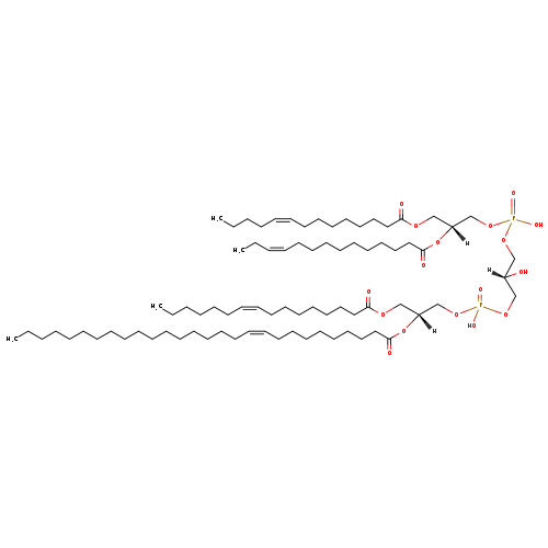 | YMDB08921 | CL(14:1(9Z)/14:1(11Z)/18:0/22:1(9Z)) | [(2R)-2-[(9Z)-docos-9-enoyloxy]-3-(octadecanoyloxy)propoxy][(2S)-2-hydroxy-3-({hydroxy[(2R)-2-[(11Z)-tetradec-11-enoyloxy]-3-[(9Z)-tetradec-9-enoyloxy]propoxy]phosphoryl}oxy)propoxy]phosphinic acid | C77H144O17P2 1403.93 | |