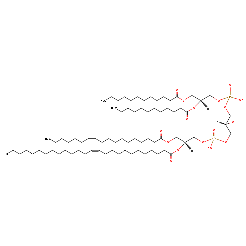 | YMDB04850 | CL(12:0/12:0/18:1(11Z)/24:0) | [(2S)-3-({[(2R)-2,3-bis(dodecanoyloxy)propoxy](hydroxy)phosphoryl}oxy)-2-hydroxypropoxy][(2R)-3-[(11Z)-octadec-11-enoyloxy]-2-(tetracosanoyloxy)propoxy]phosphinic acid | C75H144O17P2 1379.908 | |