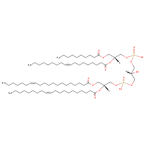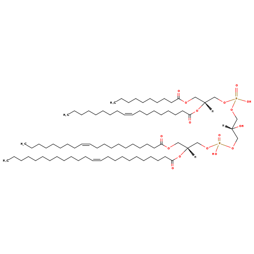 | YMDB04607 | CL(10:0/18:1(9Z)/20:0/22:1(9Z)) | [(2S)-3-({[(2R)-3-(decanoyloxy)-2-[(9Z)-octadec-9-enoyloxy]propoxy](hydroxy)phosphoryl}oxy)-2-hydroxypropoxy][(2R)-2-[(9Z)-docos-9-enoyloxy]-3-(icosanoyloxy)propoxy]phosphinic acid | C79H150O17P2 1434.0 | |