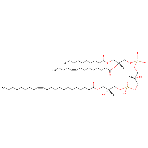 | YMDB11900 | 2-MLCL(10:0/14:1(9Z)/22:1(13Z)/0:0) | [(2R)-3-(decanoyloxy)-2-[(9Z)-tetradec-9-enoyloxy]propoxy][(2R)-3-({[(2R)-3-[(13Z)-docos-13-enoyloxy]-2-hydroxypropoxy](hydroxy)phosphoryl}oxy)-2-hydroxypropoxy]phosphinic acid | C55H104O16P2 1083.369 | |