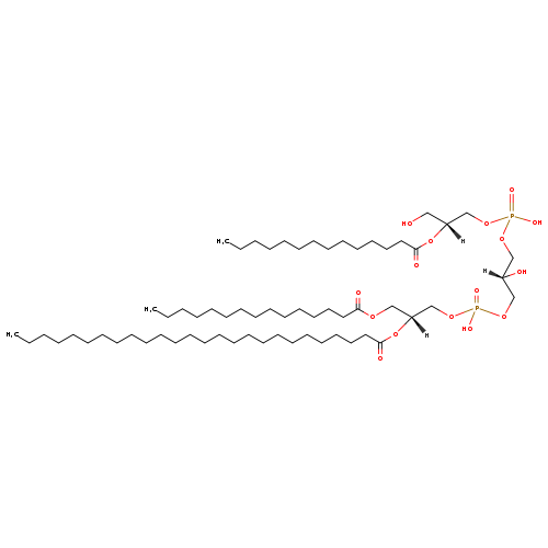 | YMDB11701 | 1-MLCL(0:0/14:0/14:0/27:0) | [(2R)-2-(heptacosanoyloxy)-3-(tetradecanoyloxy)propoxy][(2S)-2-hydroxy-3-({hydroxy[(2R)-3-hydroxy-2-(tetradecanoyloxy)propoxy]phosphoryl}oxy)propoxy]phosphinic acid | C64H126O16P2 1213.644 | |