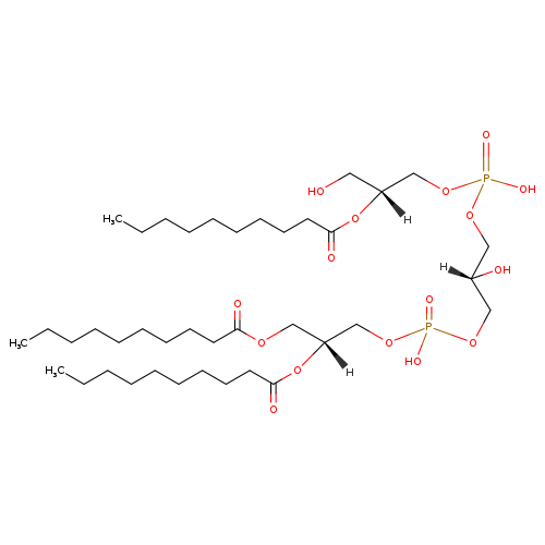 | YMDB11423 | 1-MLCL(0:0/10:0/10:0/10:0) | [(2R)-2,3-bis(decanoyloxy)propoxy][(2S)-3-({[(2R)-2-(decanoyloxy)-3-hydroxypropoxy](hydroxy)phosphoryl}oxy)-2-hydroxypropoxy]phosphinic acid | C39H76O16P2 862.969 | |