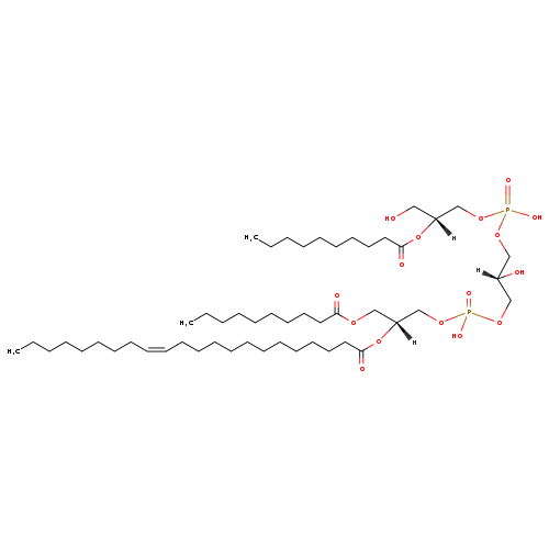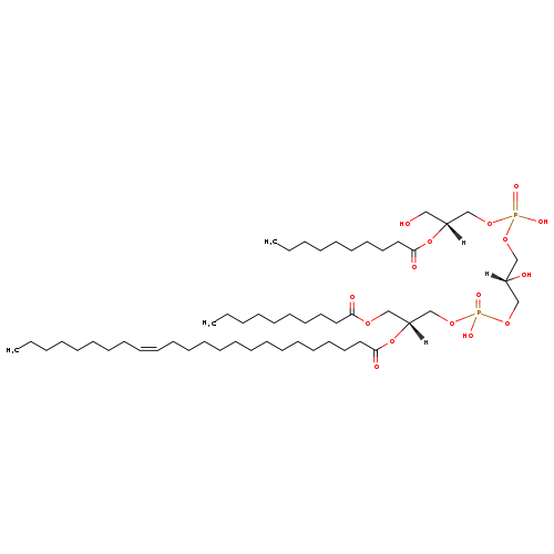 | YMDB11465 | 1-MLCL(0:0/10:0/10:0/22:1(13Z)) | [(2R)-3-(decanoyloxy)-2-[(13Z)-docos-13-enoyloxy]propoxy][(2S)-3-({[(2R)-2-(decanoyloxy)-3-hydroxypropoxy](hydroxy)phosphoryl}oxy)-2-hydroxypropoxy]phosphinic acid | C51H98O16P2 1029.277 | |