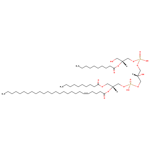 | YMDB11504 | 1-MLCL(0:0/10:0/10:0/24:1(15Z)) | [(2R)-3-(decanoyloxy)-2-[(15Z)-tetracos-15-enoyloxy]propoxy][(2S)-3-({[(2R)-2-(decanoyloxy)-3-hydroxypropoxy](hydroxy)phosphoryl}oxy)-2-hydroxypropoxy]phosphinic acid | C53H102O16P2 1057.331 | |