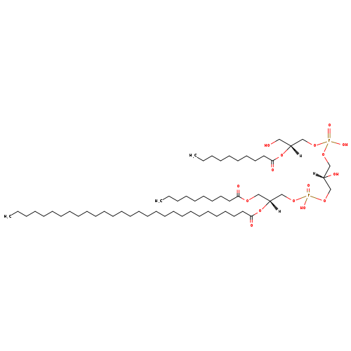 | YMDB11608 | 1-MLCL(0:0/10:0/10:0/29:0) | [(2R)-3-(decanoyloxy)-2-(nonacosanoyloxy)propoxy][(2S)-3-({[(2R)-2-(decanoyloxy)-3-hydroxypropoxy](hydroxy)phosphoryl}oxy)-2-hydroxypropoxy]phosphinic acid | C58H114O16P2 1129.482 | |