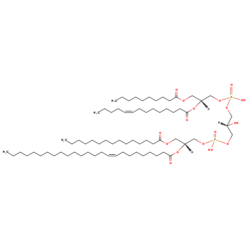 | YMDB03365 | CL(10:0/14:1(9Z)/15:0/25:1(11Z)) | [(2R)-3-(decanoyloxy)-2-[(9Z)-tetradec-9-enoyloxy]propoxy][(2R)-2-hydroxy-3-({hydroxy[(2R)-2-[(11Z)-pentacos-11-enoyloxy]-3-(pentadecanoyloxy)propoxy]phosphoryl}oxy)propoxy]phosphinic acid | C73H138O17P2 1349.838 | |
