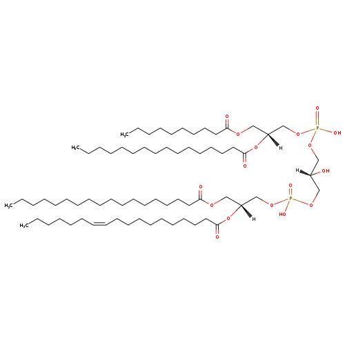 | YMDB04040 | CL(10:0/16:0/16:1(9Z)/26:1(9Z)) | [(2S)-3-({[(2R)-3-(decanoyloxy)-2-(hexadecanoyloxy)propoxy](hydroxy)phosphoryl}oxy)-2-hydroxypropoxy][(2R)-2-[(10Z)-heptacos-10-enoyloxy]-3-[(9Z)-hexadec-9-enoyloxy]propoxy]phosphinic acid | C78H148O17P2 1419.973 | |