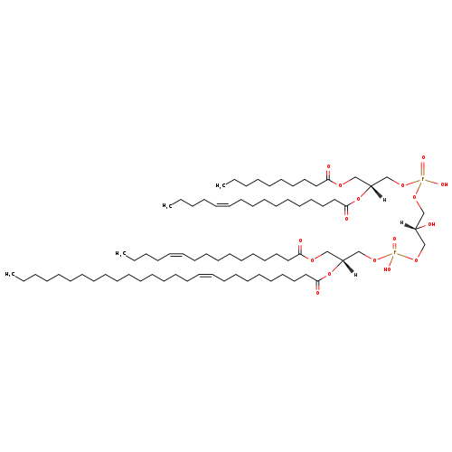 | YMDB04170 | CL(10:0/16:1(11Z)/16:1(9Z)/18:0) | [(2S)-3-({[(2R)-3-(decanoyloxy)-2-[(11Z)-hexadec-11-enoyloxy]propoxy](hydroxy)phosphoryl}oxy)-2-hydroxypropoxy][(2R)-3-[(9Z)-hexadec-9-enoyloxy]-2-(octadecanoyloxy)propoxy]phosphinic acid | C69H130O17P2 1293.73 | |