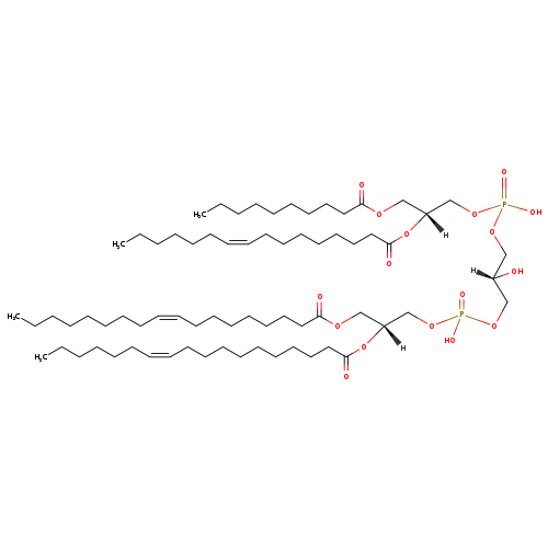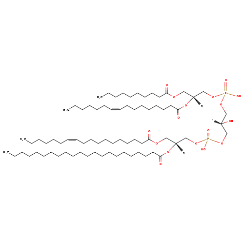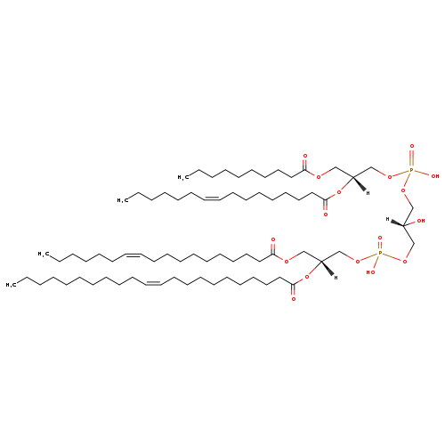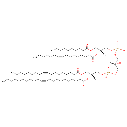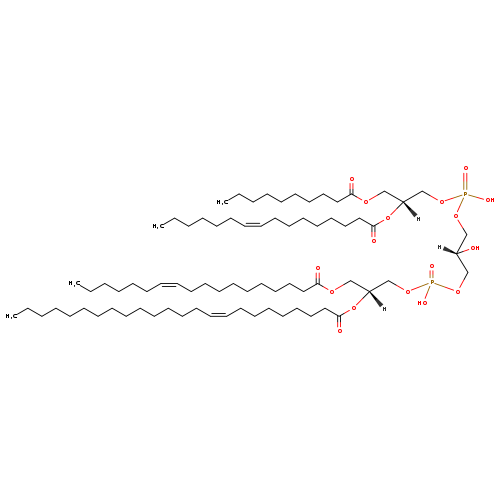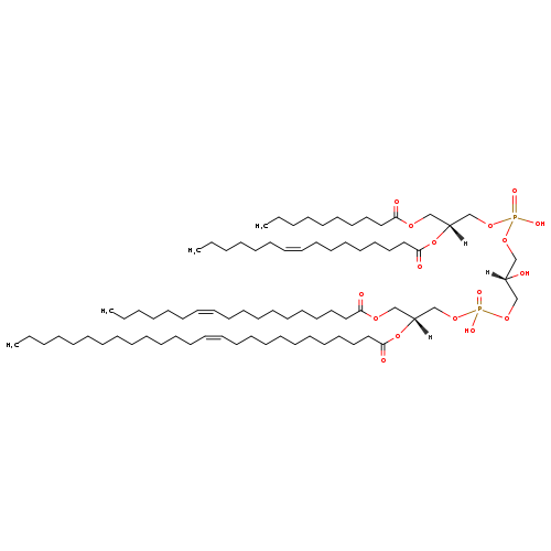 | YMDB04377 | CL(10:0/16:1(9Z)/18:1(9Z)/24:1(11Z)) | [(2R)-3-(decanoyloxy)-2-[(9Z)-hexadec-9-enoyloxy]propoxy][(2R)-2-hydroxy-3-({hydroxy[(2R)-3-[(9Z)-octadec-9-enoyloxy]-2-[(11Z)-tetracos-11-enoyloxy]propoxy]phosphoryl}oxy)propoxy]phosphinic acid | C77H144O17P2 1403.93 | |