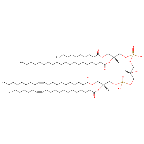 | YMDB04645 | CL(10:0/20:0/20:1(11Z)/22:1(9Z)) | [(2S)-3-({[(2R)-3-(decanoyloxy)-2-(icosanoyloxy)propoxy](hydroxy)phosphoryl}oxy)-2-hydroxypropoxy][(2R)-2-[(9Z)-docos-9-enoyloxy]-3-[(11Z)-icos-11-enoyloxy]propoxy]phosphinic acid | C81H154O17P2 1462.054 | |