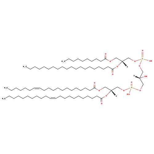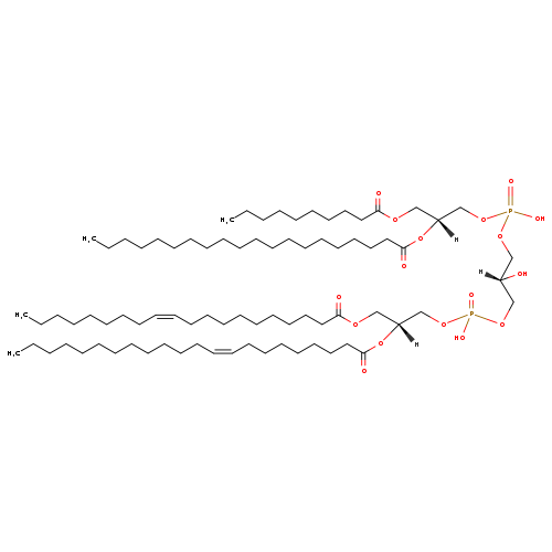 | YMDB04635 | CL(10:0/20:0/20:0/20:0) | [(2R)-2,3-bis(icosanoyloxy)propoxy][(2S)-3-({[(2R)-3-(decanoyloxy)-2-(icosanoyloxy)propoxy](hydroxy)phosphoryl}oxy)-2-hydroxypropoxy]phosphinic acid | C79H154O17P2 1438.032 | |