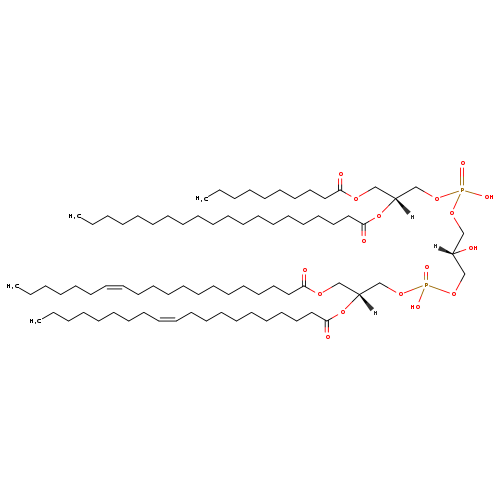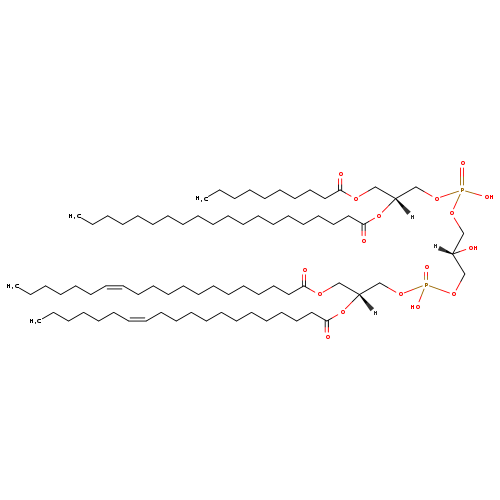 | YMDB04631 | CL(10:0/18:1(9Z)/22:1(11Z)/22:1(9Z)) | [(2S)-3-({[(2R)-3-(decanoyloxy)-2-[(9Z)-octadec-9-enoyloxy]propoxy](hydroxy)phosphoryl}oxy)-2-hydroxypropoxy][(2R)-3-[(11Z)-docos-11-enoyloxy]-2-[(9Z)-docos-9-enoyloxy]propoxy]phosphinic acid | C81H152O17P2 1460.038 | |
