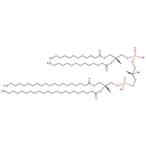 | YMDB05134 | CL(12:0/14:0/20:0/24:0) | [(2S)-3-({[(2R)-3-(dodecanoyloxy)-2-(tetradecanoyloxy)propoxy](hydroxy)phosphoryl}oxy)-2-hydroxypropoxy][(2R)-3-(icosanoyloxy)-2-(tetracosanoyloxy)propoxy]phosphinic acid | C79H154O17P2 1438.032 | |