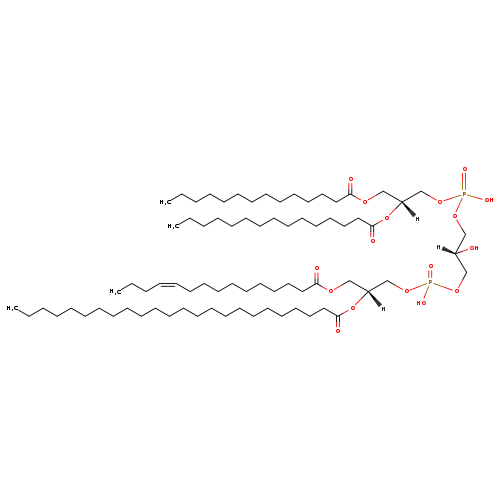 | YMDB07130 | CL(14:0/15:0/15:0/28:1(11Z)) | [(2S)-2-hydroxy-3-({hydroxy[(2R)-2-(pentadecanoyloxy)-3-(tetradecanoyloxy)propoxy]phosphoryl}oxy)propoxy][(2R)-2-[(12Z)-octacos-12-enoyloxy]-3-(pentadecanoyloxy)propoxy]phosphinic acid | C81H156O17P2 1464.07 | |