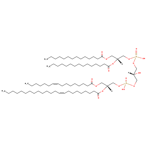 | YMDB07181 | CL(14:0/15:0/16:0/27:1(9Z)) | [(2R)-2-[(9Z)-heptacos-9-enoyloxy]-3-(hexadecanoyloxy)propoxy][(2S)-2-hydroxy-3-({hydroxy[(2R)-2-(pentadecanoyloxy)-3-(tetradecanoyloxy)propoxy]phosphoryl}oxy)propoxy]phosphinic acid | C81H156O17P2 1464.07 | |