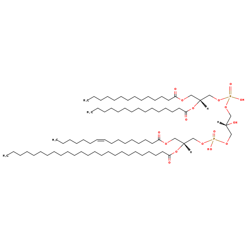 | YMDB07201 | CL(14:0/15:0/18:0/25:1(11Z)) | [(2S)-2-hydroxy-3-({hydroxy[(2R)-2-(pentadecanoyloxy)-3-(tetradecanoyloxy)propoxy]phosphoryl}oxy)propoxy][(2R)-3-(octadecanoyloxy)-2-[(11Z)-pentacos-11-enoyloxy]propoxy]phosphinic acid | C81H156O17P2 1464.07 | |