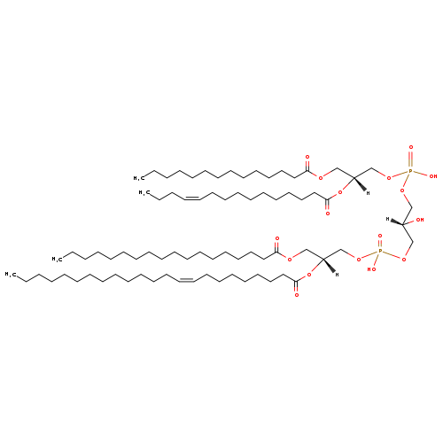 | YMDB07285 | CL(14:0/15:1(11Z)/18:0/23:1(11Z)) | [(2S)-2-hydroxy-3-({hydroxy[(2R)-2-[(11Z)-pentadec-11-enoyloxy]-3-(tetradecanoyloxy)propoxy]phosphoryl}oxy)propoxy][(2R)-3-(octadecanoyloxy)-2-[(11Z)-tricos-11-enoyloxy]propoxy]phosphinic acid | C79H150O17P2 1434.0 | |
