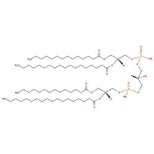 | YMDB07668 | CL(14:0/18:0/14:0/18:0) | [2-hydroxy-3-({hydroxy[(2R)-2-(octadecanoyloxy)-3-(tetradecanoyloxy)propoxy]phosphoryl}oxy)propoxy][(2R)-2-(octadecanoyloxy)-3-(tetradecanoyloxy)propoxy]phosphinic acid | C73H142O17P2 1353.87 | |