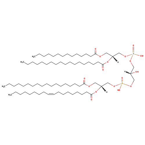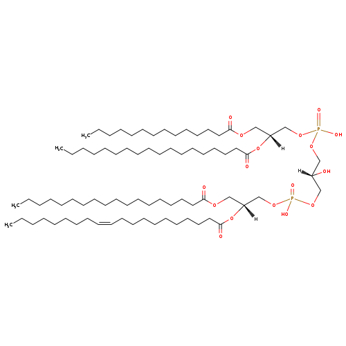 | YMDB07671 | CL(14:0/18:0/18:0/18:1(9Z)) | [(2S)-2-hydroxy-3-({hydroxy[(2R)-2-(octadecanoyloxy)-3-(tetradecanoyloxy)propoxy]phosphoryl}oxy)propoxy][(2R)-2-[(9Z)-octadec-9-enoyloxy]-3-(octadecanoyloxy)propoxy]phosphinic acid | C77H148O17P2 1407.962 | |
