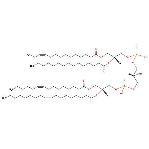 | YMDB08165 | CL(14:1(11Z)/15:0/15:1(9Z)/16:0) | [(2R)-2-(hexadecanoyloxy)-3-[(9Z)-pentadec-9-enoyloxy]propoxy][(2S)-2-hydroxy-3-({hydroxy[(2R)-2-(pentadecanoyloxy)-3-[(11Z)-tetradec-11-enoyloxy]propoxy]phosphoryl}oxy)propoxy]phosphinic acid | C69H130O17P2 1293.73 | |