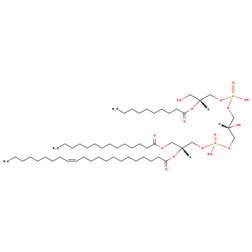 | YMDB11439 | 1-MLCL(0:0/10:0/14:0/14:1(9Z)) | [(2S)-3-({[(2R)-2-(decanoyloxy)-3-hydroxypropoxy](hydroxy)phosphoryl}oxy)-2-hydroxypropoxy][(2R)-2-[(9Z)-tetradec-9-enoyloxy]-3-(tetradecanoyloxy)propoxy]phosphinic acid | C47H90O16P2 973.169 | |