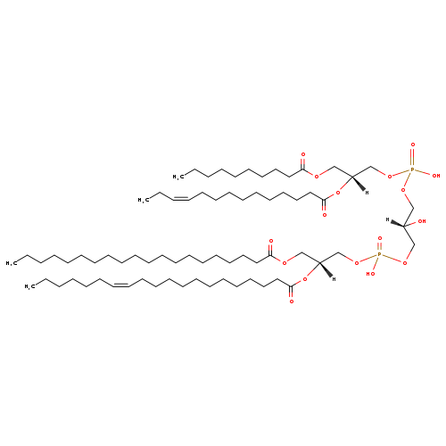 | YMDB03253 | CL(10:0/14:1(11Z)/20:0/20:1(13Z)) | [(2R)-3-(decanoyloxy)-2-[(11Z)-tetradec-11-enoyloxy]propoxy][(2R)-2-hydroxy-3-({hydroxy[(2R)-2-[(13Z)-icos-13-enoyloxy]-3-(icosanoyloxy)propoxy]phosphoryl}oxy)propoxy]phosphinic acid | C73H138O17P2 1349.838 | |