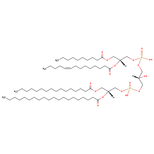 | YMDB11450 | 1-MLCL(0:0/10:0/14:1(9Z)/16:0) | [(2S)-3-({[(2R)-2-(decanoyloxy)-3-hydroxypropoxy](hydroxy)phosphoryl}oxy)-2-hydroxypropoxy][(2R)-2-(hexadecanoyloxy)-3-[(9Z)-tetradec-9-enoyloxy]propoxy]phosphinic acid | C49H94O16P2 1001.223 | |