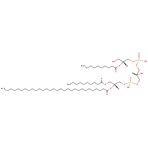 | YMDB02325 | CL(10:0/10:0/10:0/30:0) | [(2S)-3-({[(2R)-2,3-bis(decanoyloxy)propoxy](hydroxy)phosphoryl}oxy)-2-hydroxypropoxy][(2R)-3-(decanoyloxy)-2-(triacontanoyloxy)propoxy]phosphinic acid | C69H134O17P2 1297.762 | |