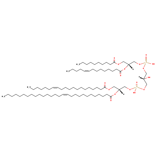 | YMDB11518 | 1-MLCL(0:0/10:0/14:1(9Z)/20:1(13Z)) | [(2S)-3-({[(2R)-2-(decanoyloxy)-3-hydroxypropoxy](hydroxy)phosphoryl}oxy)-2-hydroxypropoxy][(2R)-2-[(13Z)-icos-13-enoyloxy]-3-[(9Z)-tetradec-9-enoyloxy]propoxy]phosphinic acid | C53H100O16P2 1055.315 | |