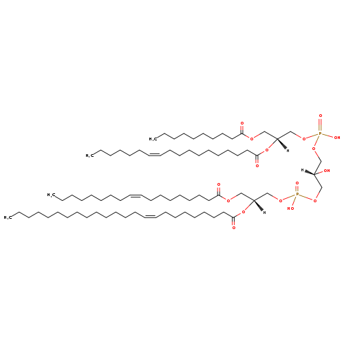 | YMDB04538 | CL(10:0/18:1(11Z)/18:1(9Z)/24:1(9Z)) | [(2S)-3-({[(2R)-3-(decanoyloxy)-2-[(11Z)-octadec-11-enoyloxy]propoxy](hydroxy)phosphoryl}oxy)-2-hydroxypropoxy][(2R)-3-[(9Z)-octadec-9-enoyloxy]-2-[(9Z)-tetracos-9-enoyloxy]propoxy]phosphinic acid | C79H148O17P2 1431.984 | |