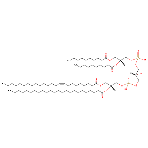| YMDB02545 | CL(10:0/10:0/24:1(9Z)/24:0) | [(2S)-3-({[(2R)-2,3-bis(decanoyloxy)propoxy](hydroxy)phosphoryl}oxy)-2-hydroxypropoxy][(2R)-3-[(9Z)-tetracos-9-enoyloxy]-2-(tetracosanoyloxy)propoxy]phosphinic acid | C77H148O17P2 1407.962 | |