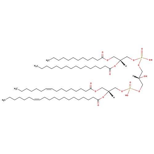| YMDB11513 | 1-MLCL(0:0/12:0/16:0/16:1(9Z)) | [(2S)-3-({[(2R)-2-(dodecanoyloxy)-3-hydroxypropoxy](hydroxy)phosphoryl}oxy)-2-hydroxypropoxy][(2R)-2-[(9Z)-hexadec-9-enoyloxy]-3-(hexadecanoyloxy)propoxy]phosphinic acid | C53H102O16P2 1057.331 | |