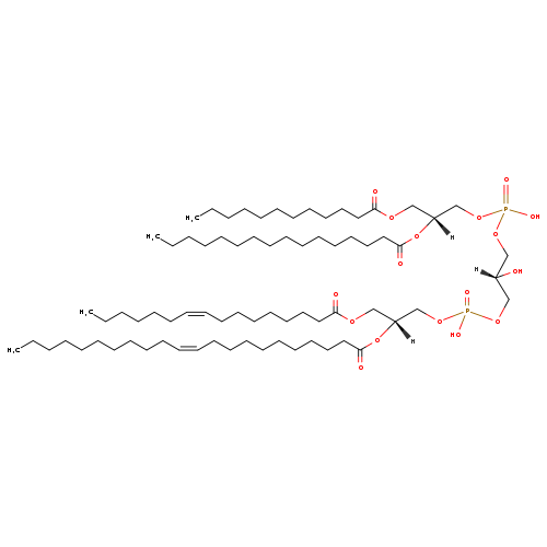 | YMDB11513 | 1-MLCL(0:0/12:0/16:0/16:1(9Z)) | [(2S)-3-({[(2R)-2-(dodecanoyloxy)-3-hydroxypropoxy](hydroxy)phosphoryl}oxy)-2-hydroxypropoxy][(2R)-2-[(9Z)-hexadec-9-enoyloxy]-3-(hexadecanoyloxy)propoxy]phosphinic acid | C53H102O16P2 1057.331 | |