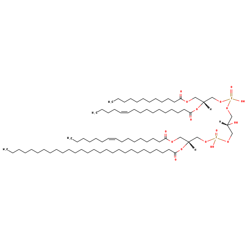 | YMDB06149 | CL(12:0/16:1(11Z)/16:1(9Z)/28:0) | [(2S)-3-({[(2R)-3-(dodecanoyloxy)-2-[(11Z)-hexadec-11-enoyloxy]propoxy](hydroxy)phosphoryl}oxy)-2-hydroxypropoxy][(2R)-3-[(9Z)-hexadec-9-enoyloxy]-2-(octacosanoyloxy)propoxy]phosphinic acid | C81H154O17P2 1462.054 | |