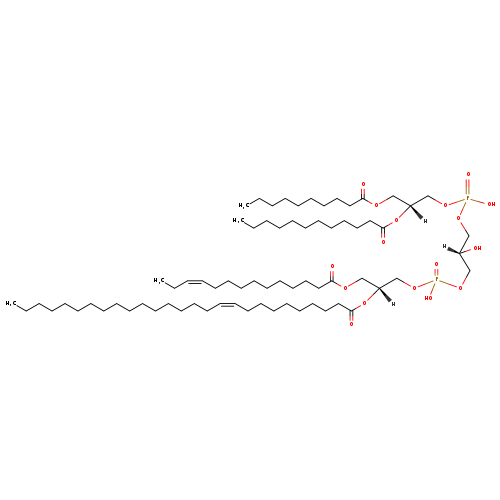 | YMDB02589 | CL(10:0/12:0/14:1(11Z)/26:1(9Z)) | [(2S)-3-({[(2R)-3-(decanoyloxy)-2-(dodecanoyloxy)propoxy](hydroxy)phosphoryl}oxy)-2-hydroxypropoxy][(2R)-2-[(10Z)-heptacos-10-enoyloxy]-3-[(11Z)-tetradec-11-enoyloxy]propoxy]phosphinic acid | C72H136O17P2 1335.811 | |