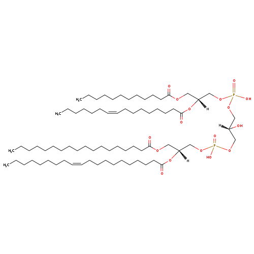 | YMDB11571 | 1-MLCL(0:0/12:0/16:1(9Z)/18:0) | [(2S)-3-({[(2R)-2-(dodecanoyloxy)-3-hydroxypropoxy](hydroxy)phosphoryl}oxy)-2-hydroxypropoxy][(2R)-3-[(9Z)-hexadec-9-enoyloxy]-2-(octadecanoyloxy)propoxy]phosphinic acid | C55H106O16P2 1085.385 | |